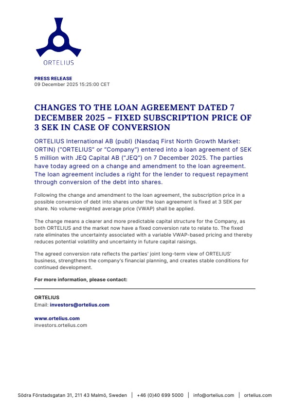 ORTELIUS International AB (publ) (Nasdaq First North Growth Market: ORTIN) (“ORTELIUS” or “Company”) entered into a loan agreement of SEK 5 million with JEQ Capital AB (“JEQ”) on 7 December 2025. The parties have today agreed on a change and amendment to the loan agreement. The loan agreement includes a right for the lender to request repayment through conversion of the debt into shares.