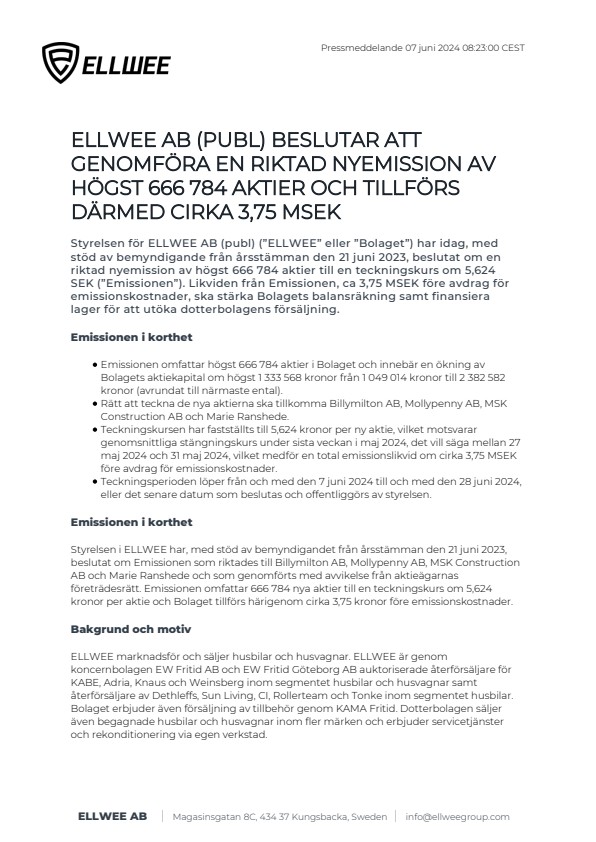 Styrelsen för ELLWEE AB (publ) (”ELLWEE” eller ”Bolaget”) har idag, med stöd av bemyndigande från årsstämman den 21 juni 2023, beslutat om en riktad nyemission av högst 666 784 aktier till en teckningskurs om 5,624 SEK (”Emissionen”). Likviden från Emissionen, ca 3,75 MSEK före avdrag för emissionskostnader, ska stärka Bolagets balansräkning samt finansiera lager för att utöka dotterbolagens försäljning.