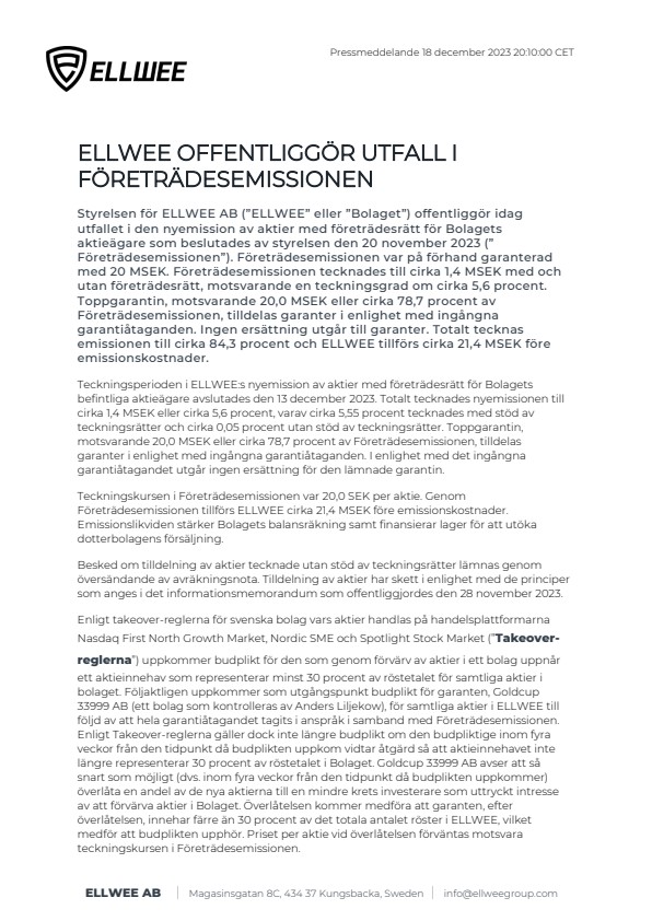Teckningsperioden i ELLWEE:s nyemission av aktier med företrädesrätt för Bolagets befintliga aktieägare avslutades den 13 december 2023. Totalt tecknades nyemissionen till cirka 1,4 MSEK eller cirka 5,6 procent, varav cirka 5,55 procent tecknades med stöd av teckningsrätter och cirka 0,05 procent utan stöd av teckningsrätter. Toppgarantin, motsvarande 20,0 MSEK eller cirka 78,7 procent av Företrädesemissionen, tilldelas garanter i enlighet med ingångna garantiåtaganden. I enlighet med det ingångna garantiåtagandet utgår ingen ersättning för den lämnade garantin.