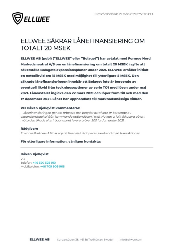 ELLWEE AB (publ) (”ELLWEE” eller ”Bolaget”) har avtalat med Formue Nord Markedsneutral A/S om en lånefinansiering om totalt 20 MSEK i syfte att säkerställa Bolagets expansionsplaner under 2021. ELLWEE erhåller initialt en nettolikvid om 15 MSEK med möjlighet till ytterligare 5 MSEK. Den säkrade lånefinansieringen innebär att Bolaget inte är beroende av eventuell likvid från teckningsoptioner av serie TO1 med lösen under maj 2021. Låneavtalet ingicks den 22 mars 2021 och löper fram till och med den 17 december 2021. Lånet har upphandlats till marknadsmässiga villkor.
