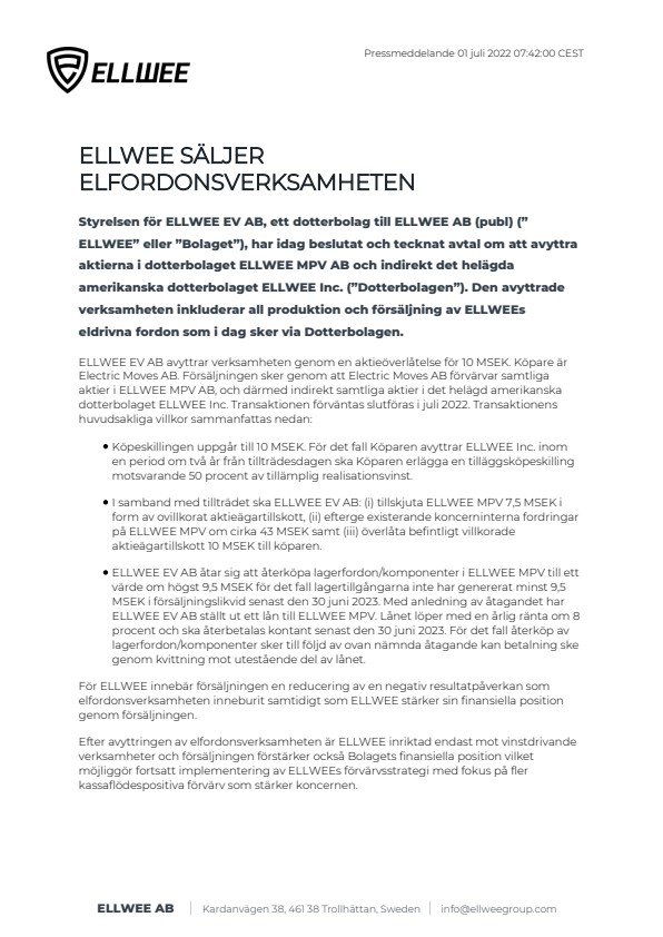 ELLWEE EV AB avyttrar verksamheten genom en aktieöverlåtelse för 10 MSEK. Köpare är Electric Moves AB. Försäljningen sker genom att Electric Moves AB förvärvar samtliga aktier i ELLWEE MPV AB, och därmed indirekt samtliga aktier i det helägd amerikanska dotterbolaget ELLWEE Inc. Transaktionen förväntas slutföras i juli 2022. Transaktionens huvudsakliga villkor sammanfattas nedan: