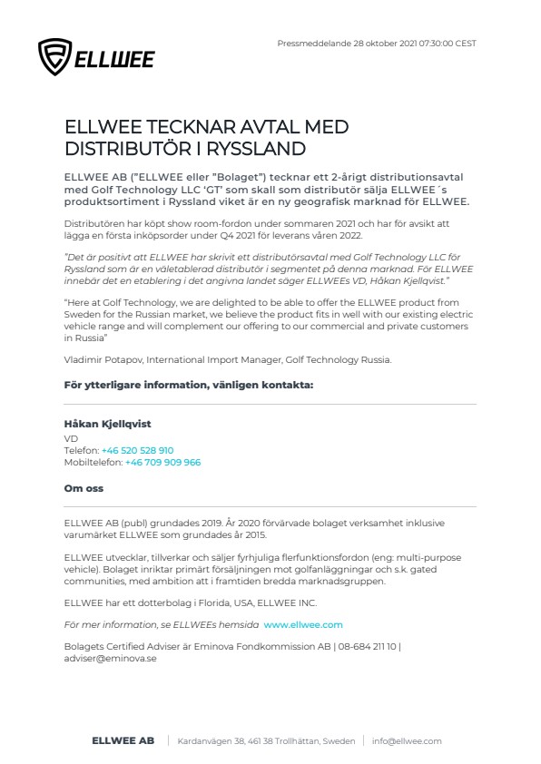 ELLWEE AB (”ELLWEE eller ”Bolaget”) tecknar ett 2-årigt distributionsavtal med Golf Technology LLC ‘GT’ som skall som distributör sälja ELLWEE´s produktsortiment i Ryssland viket är en ny geografisk marknad för ELLWEE.
