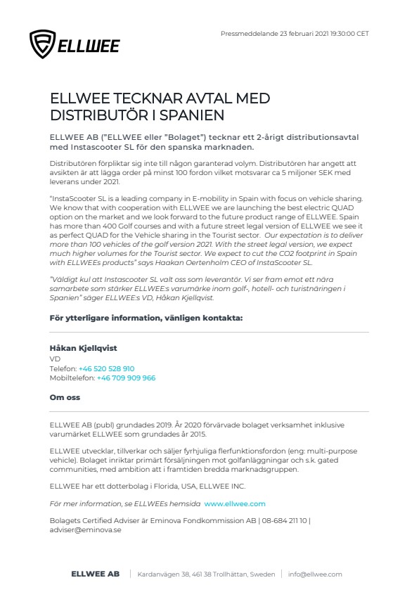 “InstaScooter SL is a leading company in E-mobility in Spain with focus on vehicle sharing. We know that with cooperation with ELLWEE we are launching the best electric QUAD option on the market and we look forward to the future product range of ELLWEE. Spain has more than 400 Golf courses and with a future street legal version of ELLWEE we see it as perfect QUAD for the Vehicle sharing in the Tourist sector. Our expectation is to deliver more than 100 vehicles of the golf version 2021. With the street legal version, we expect much higher volumes for the Tourist sector. We expect to cut the CO2 footprint in Spain with ELLWEEs products” says Haakan Oertenholm CEO of InstaScooter SL.