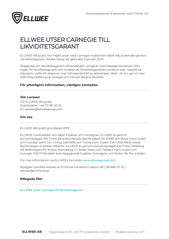 ELLWEE AB (publ.) har ingått avtal med Carnegie Investment Bank AB, avseende tjänsten Likviditetsgaranti. Avtalet börjar att gälla den 2 januari 2024.