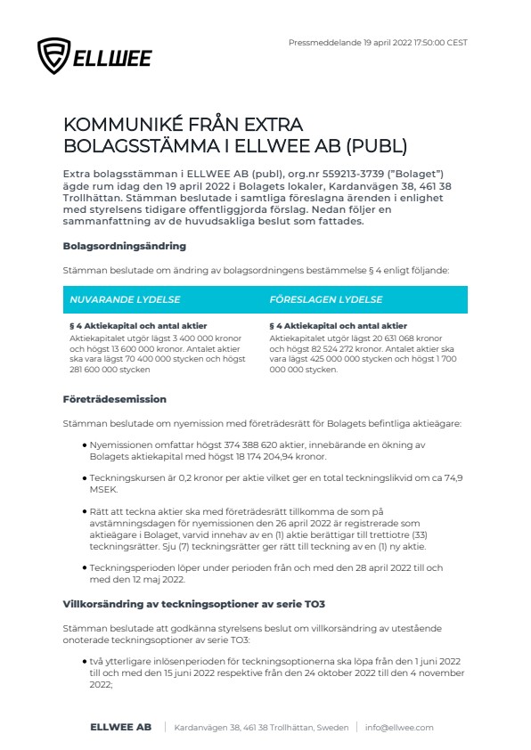 Extra bolagsstämman i ELLWEE AB (publ), org.nr 559213-3739 (”Bolaget”) ägde rum idag den 19 april 2022 i Bolagets lokaler, Kardanvägen 38, 461 38 Trollhättan. Stämman beslutade i samtliga föreslagna ärenden i enlighet med styrelsens tidigare offentliggjorda förslag. Nedan följer en sammanfattning av de huvudsakliga beslut som fattades.