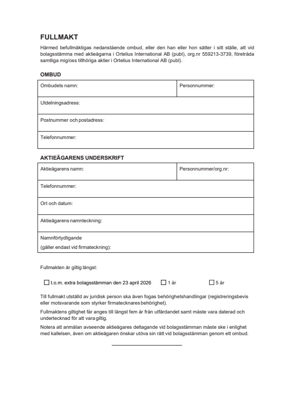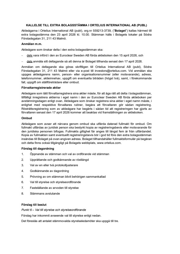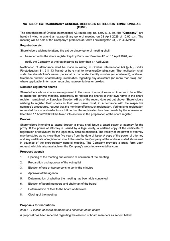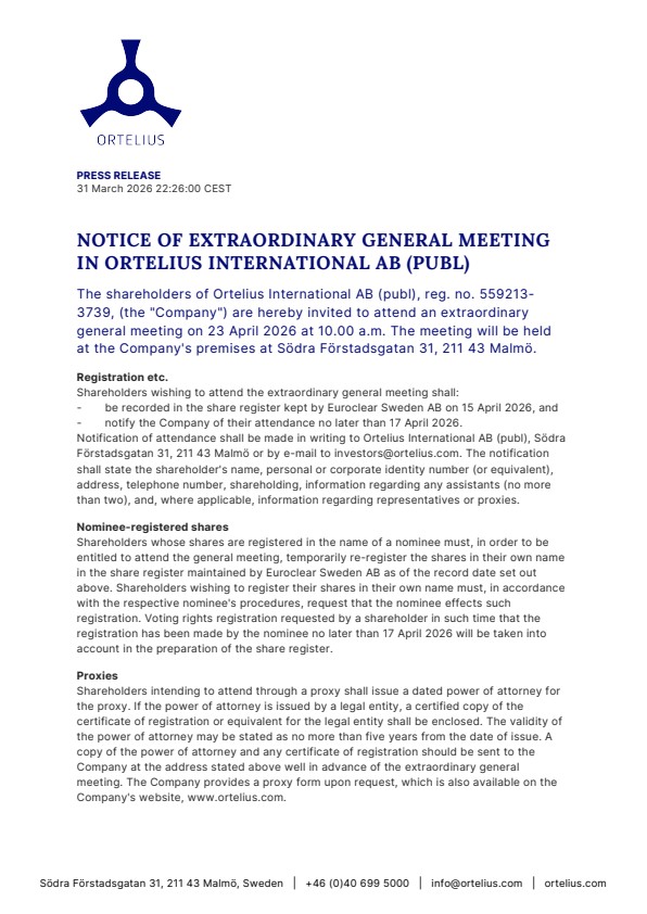 The shareholders of Ortelius International AB (publ), reg. no. 559213-3739, (the “Company”) are hereby invited to attend an extraordinary general meeting on 23 April 2026 at 10.00 a.m. The meeting will be held at the Company’s premises at Södra Förstadsgatan 31, 211 43 Malmö.