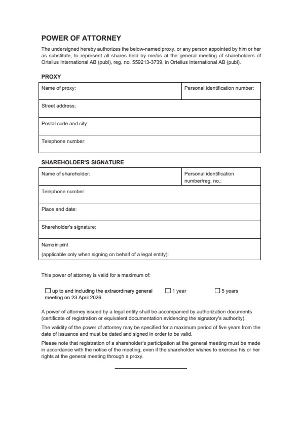 Shareholders intending to attend through a proxy shall issue a dated power of attorney for the proxy. If the power of attorney is issued by a legal entity, a certified copy of the certificate of registration or equivalent for the legal entity shall be enclosed. The validity of the power of attorney may be stated as no more than five years from the date of issue. A copy of the power of attorney and any certificate of registration should be sent to the Company at the address stated above well in advance of the extraordinary general meeting. The Company provides a proxy form upon request, which is also available on the Company’s website, www.ortelius.com.