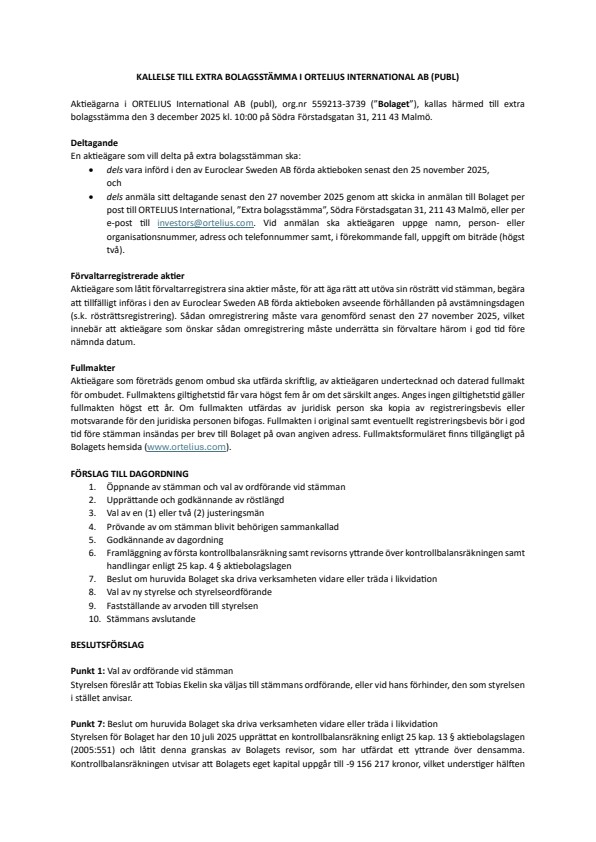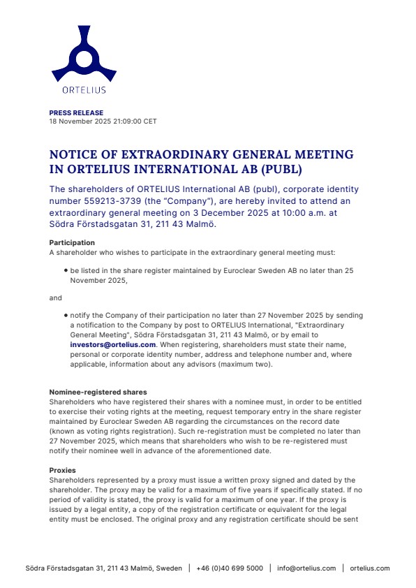 The shareholders of ORTELIUS International AB (publ), corporate identity number 559213-3739 (the “Company”), are hereby invited to attend an extraordinary general meeting on 3 December 2025 at 10:00 a.m. at Södra Förstadsgatan 31, 211 43 Malmö.