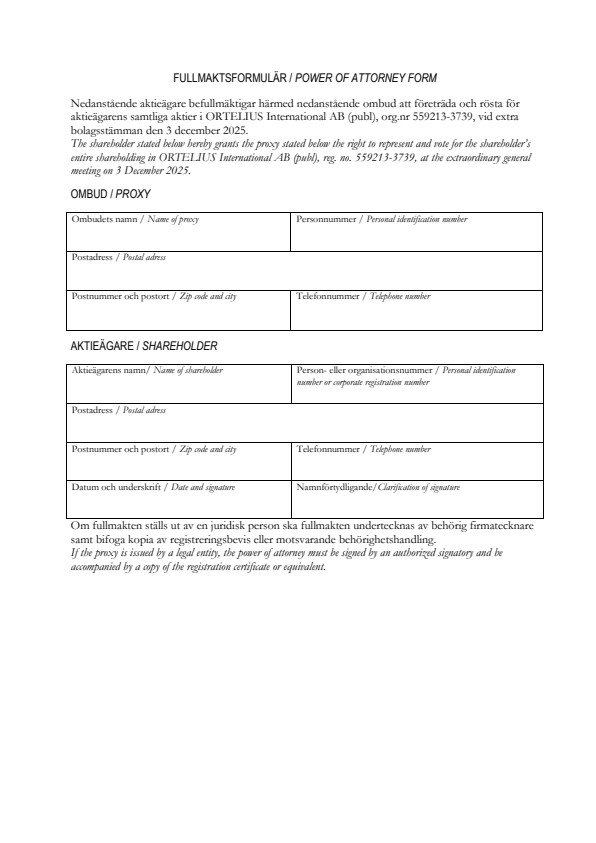 - notify the Company of their participation no later than 27 November 2025 by sending a notification to the Company by post to ORTELIUS International, “Extraordinary General Meeting”, Södra Förstadsgatan 31, 211 43 Malmö, or by email to investors@ortelius.com. When registering, shareholders must state their name, personal or corporate identity number, address and telephone number and, where applicable, information about any advisors (maximum two).