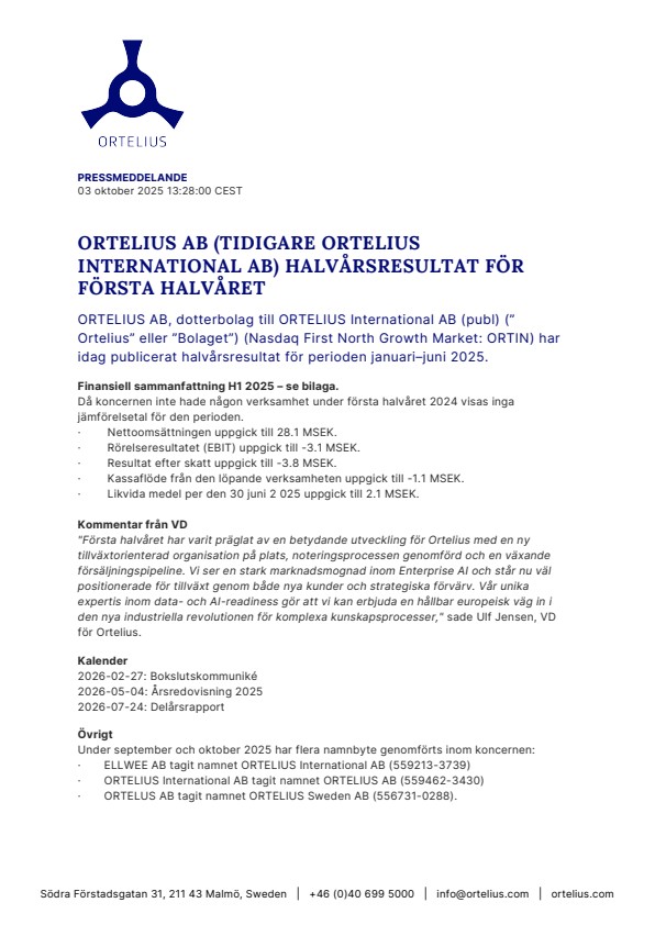 “Första halvåret har varit präglat av en betydande utveckling för Ortelius med en ny tillväxtorienterad organisation på plats, noteringsprocessen genomförd och en växande försäljningspipeline. Vi ser en stark marknadsmognad inom Enterprise AI och står nu väl positionerade för tillväxt genom både nya kunder och strategiska förvärv. Vår unika expertis inom data- och AI-readiness gör att vi kan erbjuda en hållbar europeisk väg in i den nya industriella revolutionen för komplexa kunskapsprocesser,” sade Ulf Jensen, VD för Ortelius.