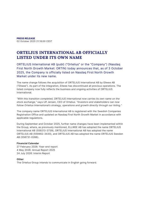 ORTELIUS International AB (publ) (“Ortelius” or the “Company”) (Nasdaq First North Growth Market: ORTIN) today announces that, as of 3 October 2025, the Company is officially listed on Nasdaq First North Growth Market under its new name.