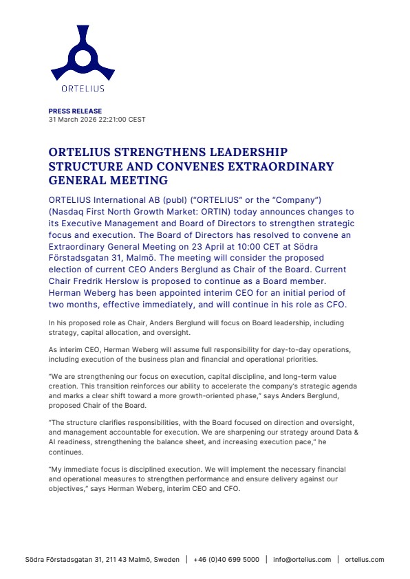 ORTELIUS International AB (publ) (“ORTELIUS” or the “Company”) (Nasdaq First North Growth Market: ORTIN) today announces changes to its Executive Management and Board of Directors to strengthen strategic focus and execution. The Board of Directors has resolved to convene an Extraordinary General Meeting on 23 April at 10:00 CET at Södra Förstadsgatan 31, Malmö. The meeting will consider the proposed election of current CEO Anders Berglund as Chair of the Board. Current Chair Fredrik Herslow is proposed to continue as a Board member. Herman Weberg has been appointed interim CEO for an initial period of two months, effective immediately, and will continue in his role as CFO.
