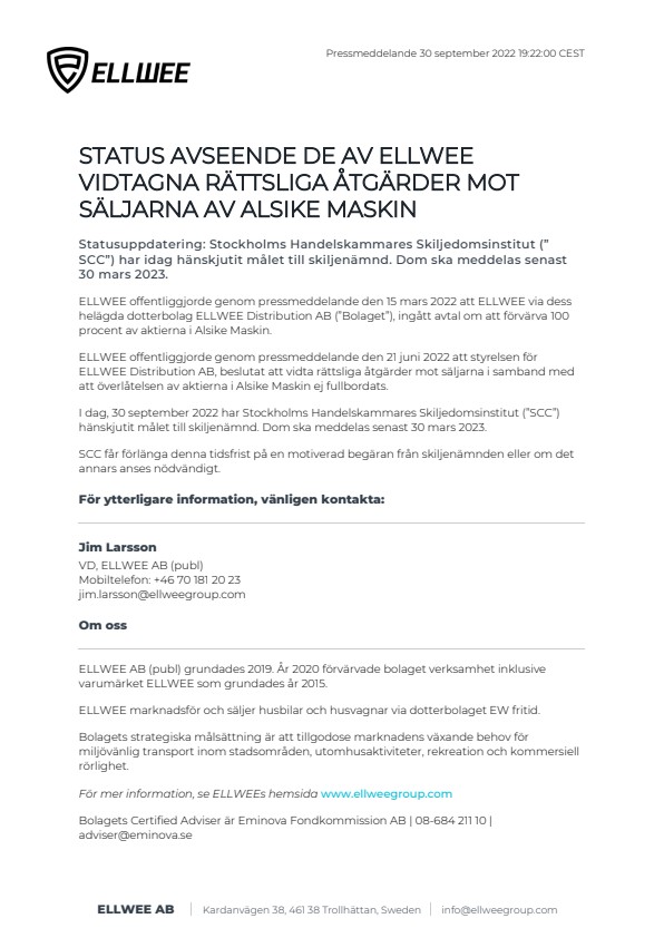 ELLWEE offentliggjorde genom pressmeddelande den 21 juni 2022 att styrelsen för ELLWEE Distribution AB, beslutat att vidta rättsliga åtgärder mot säljarna i samband med att överlåtelsen av aktierna i Alsike Maskin ej fullbordats.